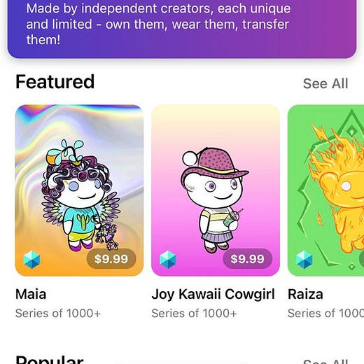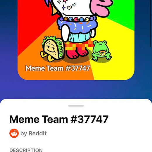 Reddit quietly launched a collection of Polygon NFTs that look about like what you would expect a corporate art collection to look like. Interestingly rather than calling them NFTs they are choosing to call them collectible avatars. I predict this feature will be as transformative and impactful as MOONs, the cryptocurrency they launched back in 2020. (Disclaimer: I used to work at Reddit back in 2019, before these features existed. It was a simpler time.)
