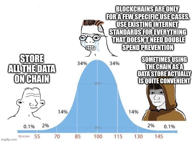 Which brings us to Vitalik’s midwit meme at the top of the section. He argues that when enough people are reading/writing to the blockchain for transactions it will be more convenient and practical to store identity information on the blockchain as well. Vitalik believes blockspace will eventually be cheap enough that the convenience will overcome the cost — but even if you stipulate that blockspace will eventually be cheap I’m still not convinced SBTs will be useful.
