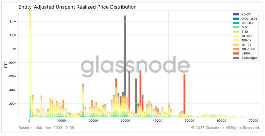 So that bar is a single whale (or a small pod of whales) that acquired ~600k bitcoin at a price of ~$48k/btc, representing ~$28.8B worth of bitcoin purchased near the top during the 2021 bullrun and held for three years through a ~75% downturn. The graph above was from December 9th. Let’s check on how things look now: