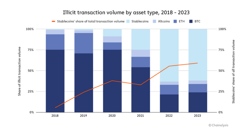 According to blockchain analysis firm Chainalysis’s annual crypto crime report there were roughly ~$24.2B worth of cryptocurrency transactions in 2023 used for illicit purposes like ransomware or evading sanctions. That’s ~0.34% of overall cryptocurrency transaction volume, down from ~0.42% in 2022. Roughly ~2/3rds of those transactions were done using stablecoins, particularly Tether (USDT) on the Tron network.