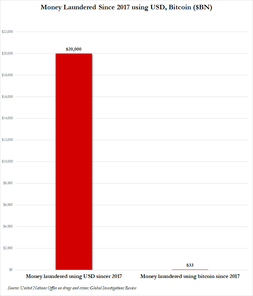 In other words, the vast majority of cryptocurrency activity is not criminal, the vast majority of criminal activity does not use cryptocurrency and even for criminals who do their crimes on a blockchain: the dollar is still their currency of choice. Someone should probably warn Jamie Dimon!