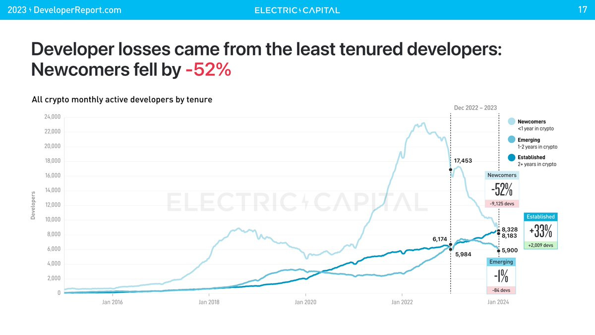 Here is a very interesting report from Electric Capital on the growth and shape of the developer ecosystem in the broader crypto industry. Particularly interesting to me was how the total supply of developers shrank (-24%) but the pool of experienced developers grew (+16%) — most of the attrition came from relatively new developers. This strikes me as amusingly parallel to the dynamics in bitcoin investing: those without conviction gets shaken out by the volatility — but anyone who survives their first bear winter is probably here to stay.
